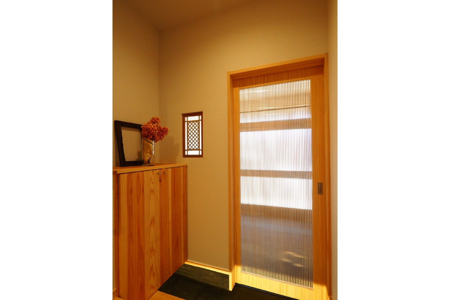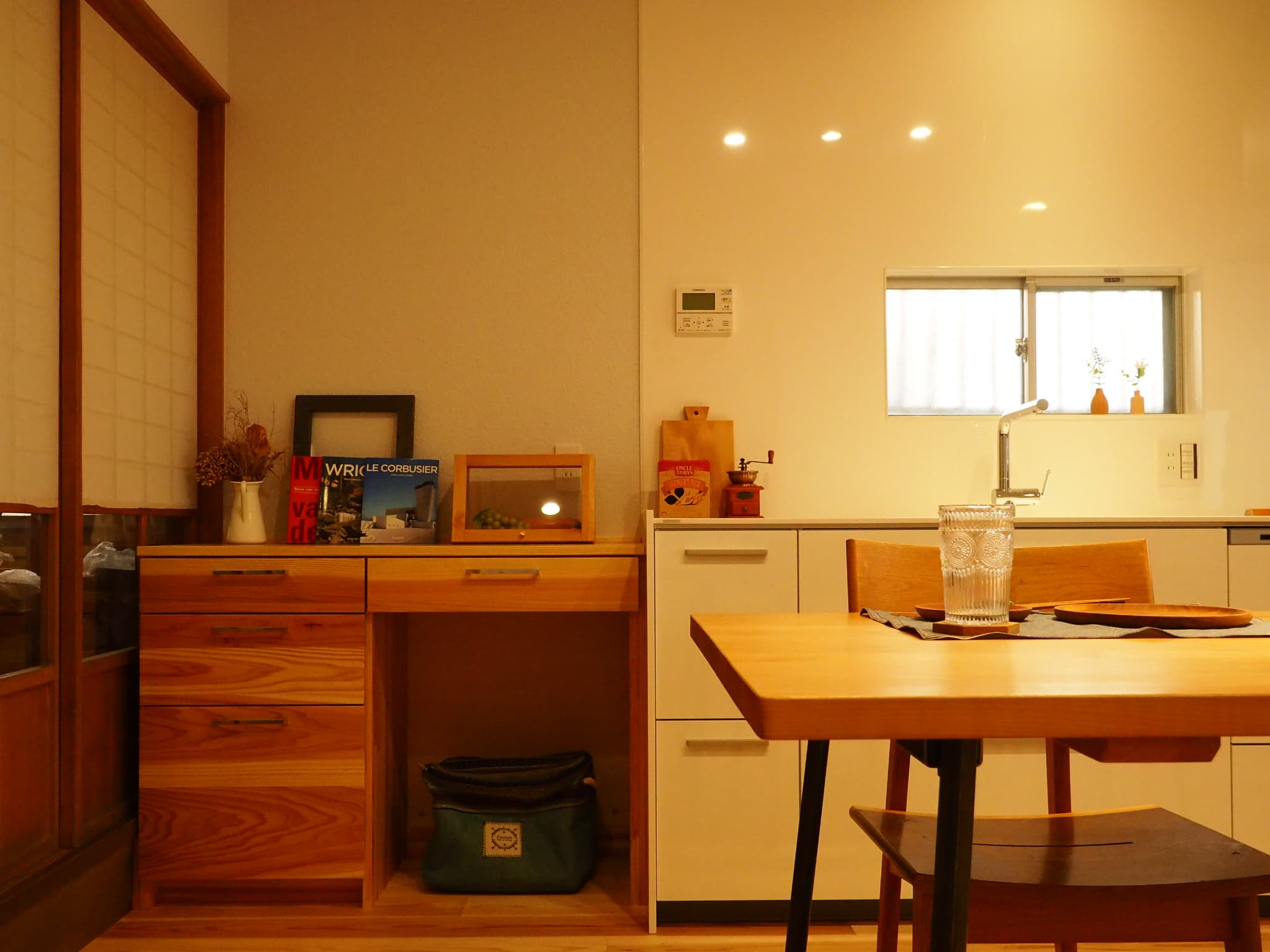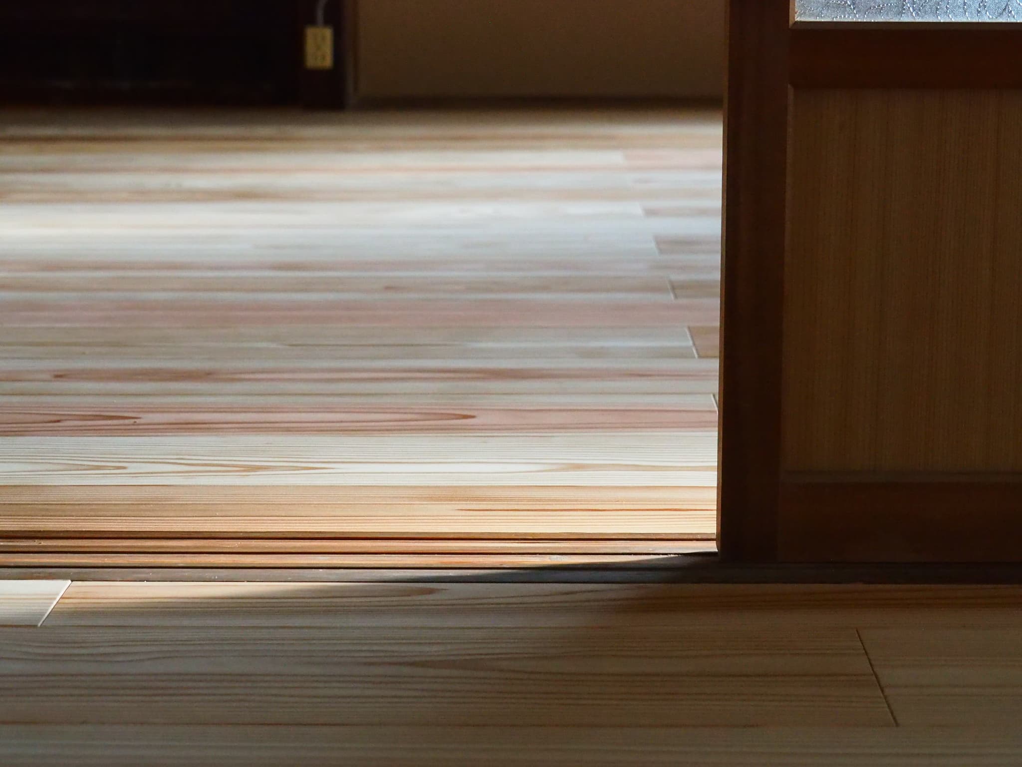 古民家に合うように、国産の杉のフローリングや杉の建具・家具で統一しコーディネートを行いました。