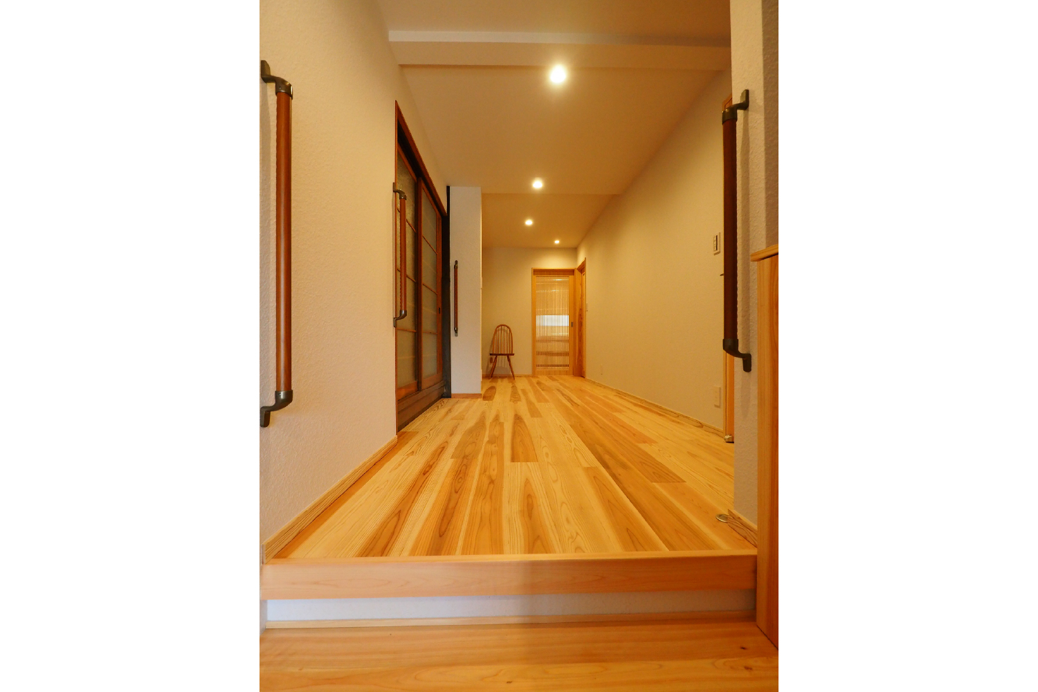 通り土間に床組を施し段差を少なく。どうしても残る段差には手すりを設置し、
